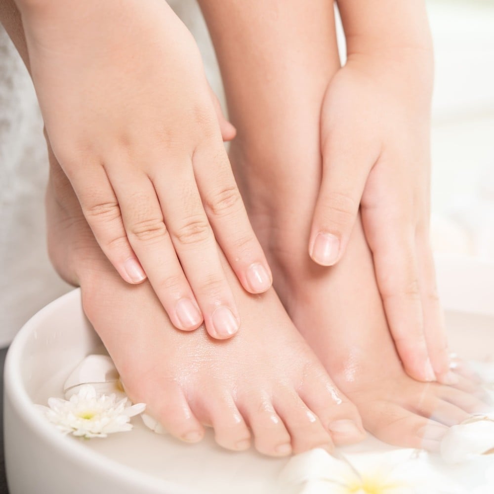 ١- تنقيع الاقدام، بالماء الدافئ مع ملح البحر الميت الذي يساعد على تطهير وازالة السموم من الجلد.